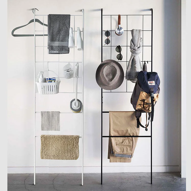 2. Navpična zasnova je preprosta in elegantna ter ima sodobno in industrijsko estetiko. Dobro izkorišča navpični prostor. Kombinacija rešetk in prečk omogoča prosto postavitev obešalnih pozicij glede na individualne potrebe in estetske preference, s čimer dosežemo funkcionalnost in lepoto.